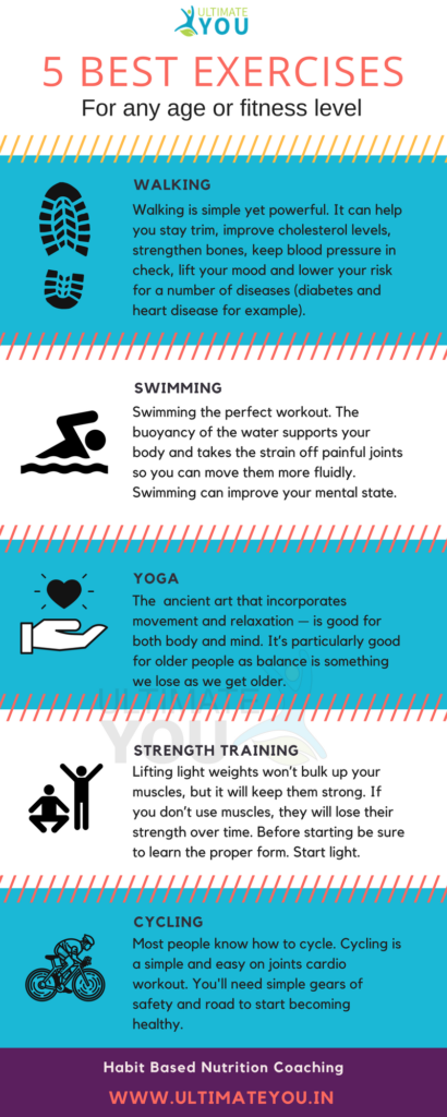 Here is an infographic of some of the simplest and most effective exercises you can do at any age (without great training and expense).